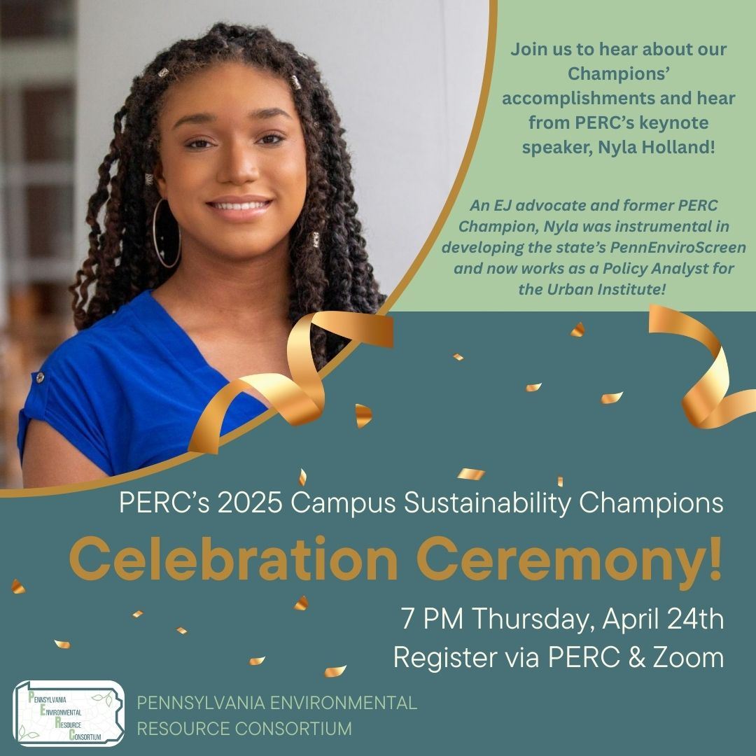 In March of 2025, PERC announced the 2025 cohort of Campus Sustainability Champions. This year, after undergoing a robust review process, PERC awarded 30 nominees with the Campus Sustainability Champion title. Across 10 institutions, PERC awarded 2 individual students, 5 student groups, and 4 faculty, staff, and campus affiliates. During the celebration, PERC was excited to highlight the efforts of our member institutions' students, faculty, and staff that are dedicated to the pursuit of sustainability on Pennsylvania's campuses. |