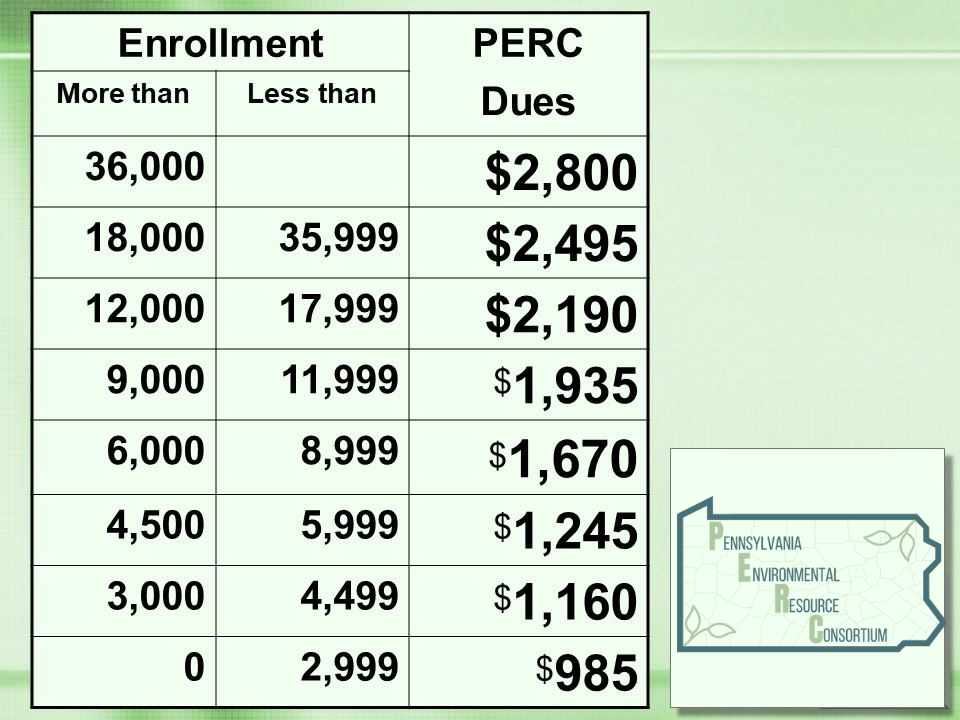 PERC institutional dues form the cornerstone of revenue that funds PERC's activities; corporate sponsorships and grants constitute the rest. Dues are paid for membership on a fiscal year basis: July 1st to June 30th. Dues levels are tiered, based on enrollment.